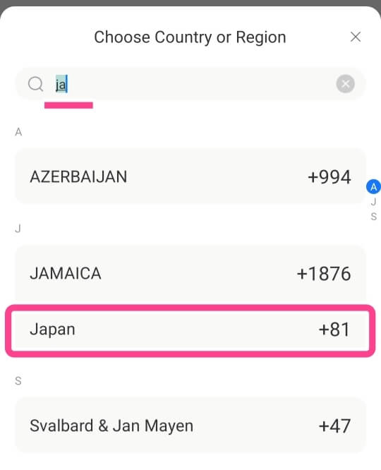 検索欄に”ja”等を入力すると候補にJapan(+81)が出るので選択します。