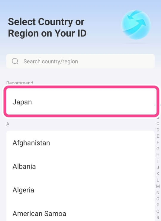 居住国の選択になるので、Japanを選択します。通常はRecommend(オススメ)に表示されるので選んでください。