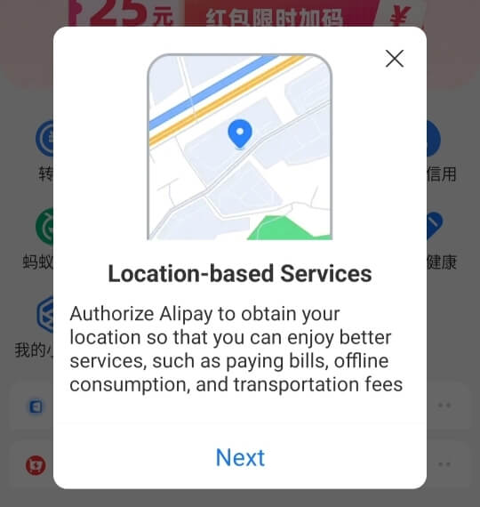 アプリが起動します。位置情報を有効にしろというメッセージがでます。Alipayで配車サービスも利用する場合は必要になります。