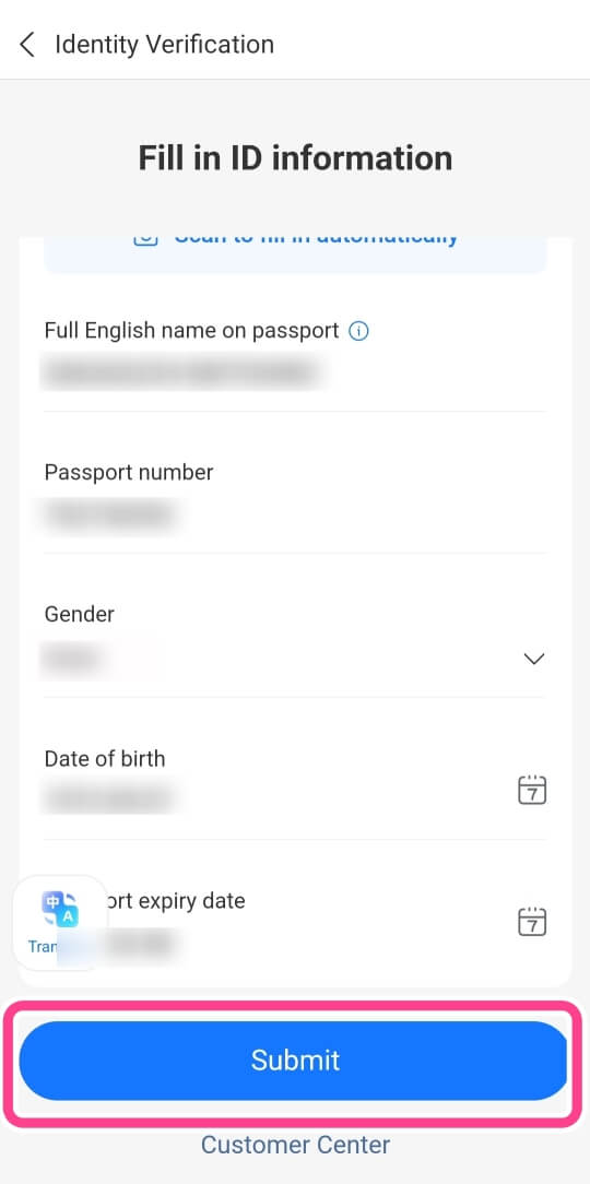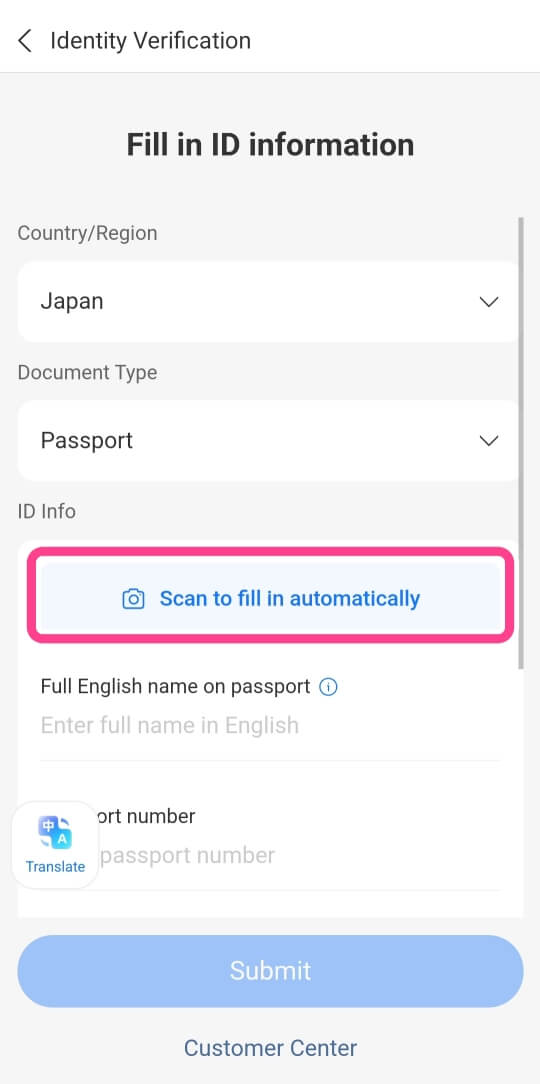 個人情報の入力画面が表示されます。国やドキュメントタイプは元のままで大丈夫です。Scan to fill in automatically(スキャンして自動入力)をタップします。