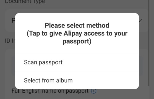 カメラでスキャンするか(Scan passport)、アルバムから画像を選ぶか(Select from Album)を選択します。ここではスキャンを選択しています。