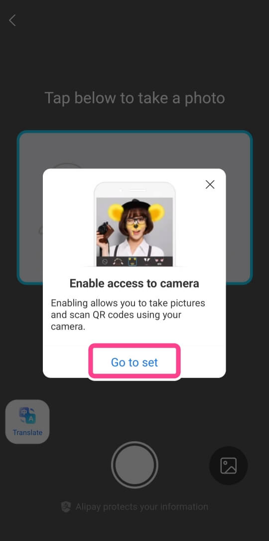 カメラの権限を付与するように指示がでます。Go to setをタップして進みます。