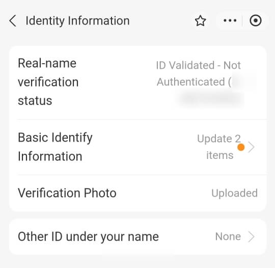 Real-name Verification(実名認証)の欄にカッコ付きで名前が表示されるようになり、実名認証待ちの表示になります。