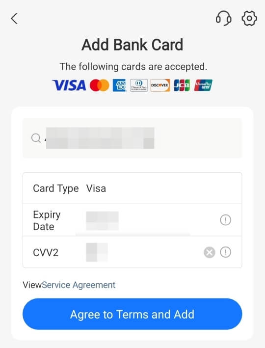 カードの有効期限、セキュリティーコード(CVV2)を入力します。入力したらAgree to Terms and Add(規約に同意して登録)をタップします。