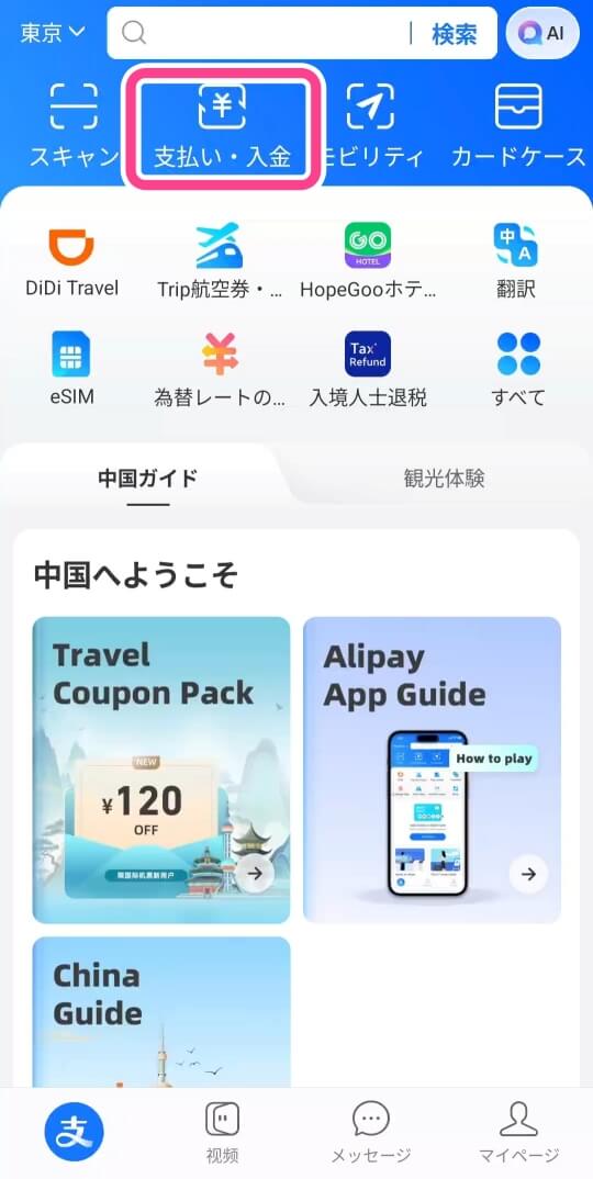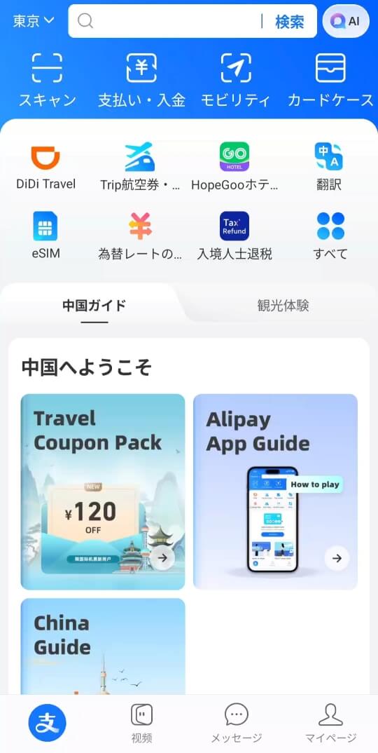 Alipayアプリには機能がたくさんあります。しかし中国旅行で使うのはごく一部です。支払いなど基本機能は日本のPaypayとほぼ同じなので簡単だと思います。