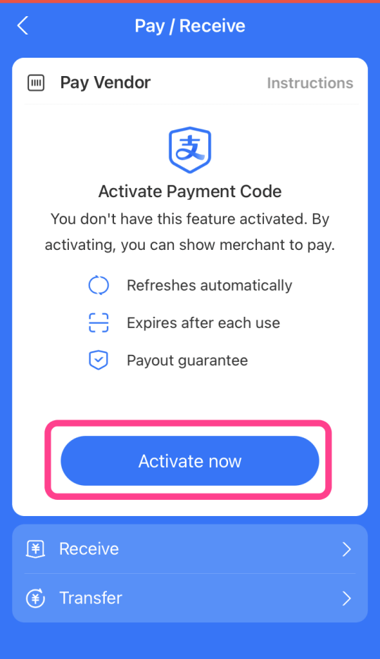 支払い機能を利用すると以下の画面がでるのでActivate now(有効化する)をタップします。