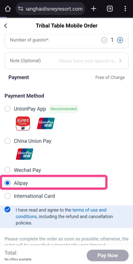 支払い方法にAlipay(やWechat Pay)などスマホ決済を選択できます。Alipayを選びます。