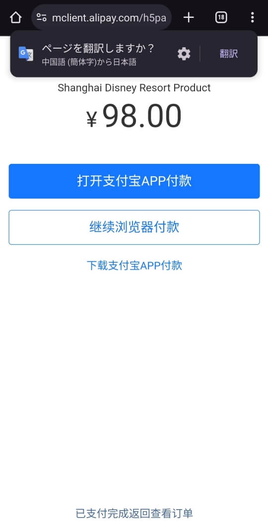 Alipayアプリが起動するので、打开支付宝APP付款(Alipayアプリで支払い)を押します。自動遷移するケースもあります。