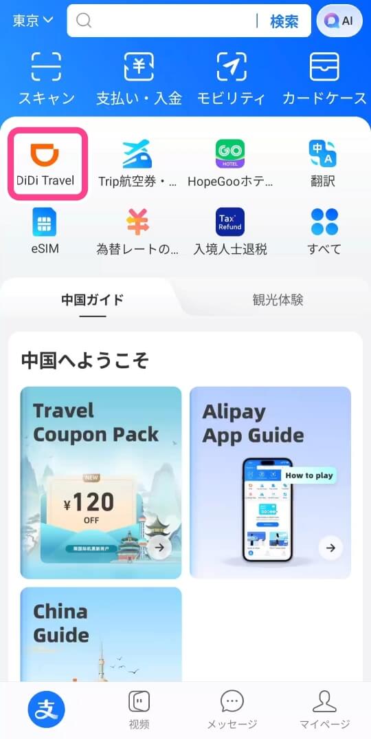 DIDIのアプリをインストールしなくてもAlipayアプリからDIDIを利用できます。