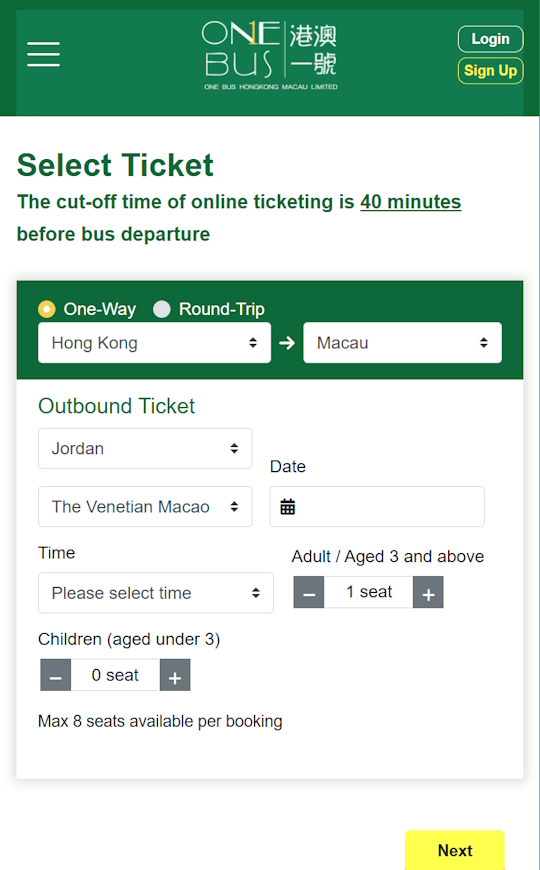 行き先は、マカオ(澳门/Macau)と中国本土の珠海(Zhuhai/しゅかい)の2つあります。マカオの方に進みましょう。