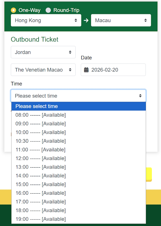 - 到着地: マカオ外港埠頭(アウターハーバー・フェリーターミナル/マカオ半島側)