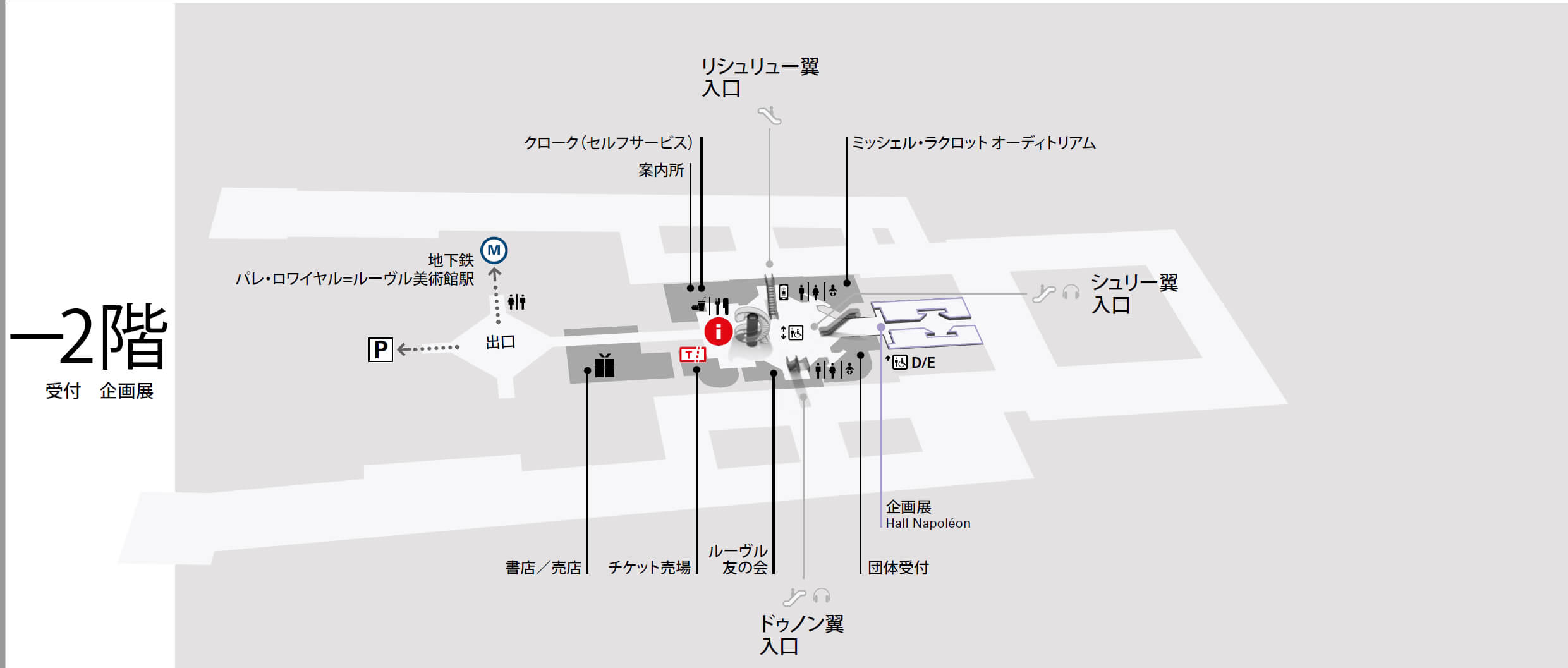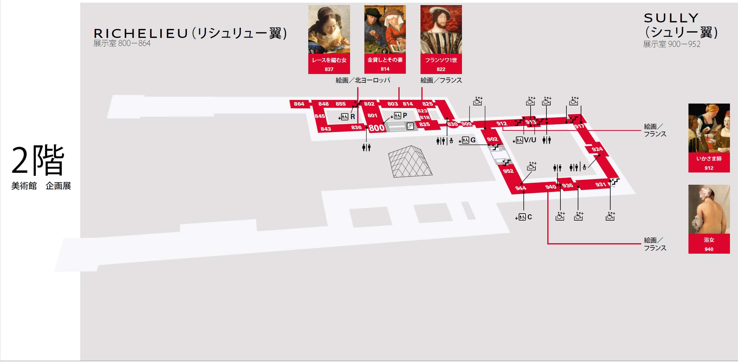 頭の部分がシュリー翼(SULLY)、左側がリシュリュー翼(RICHELIEU)、右側がドゥノン翼(DENON)と呼ばれます。