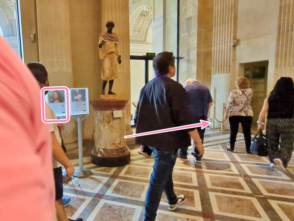 基本的には「モナリザの絵が書かれたルート案内にしたがって」進んでください。今後、改装の影響で紹介したルートが変わる可能性もありますが、「モナリザの案内を追いかければ良い」というポイントを覚えておけば大丈夫です。