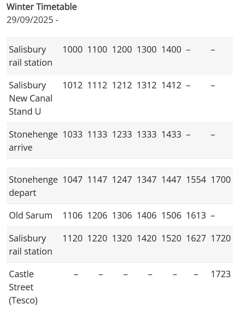 計画を立てる場合、ソールズベリー駅からストーンヘンジ行きのバスが夏以外は少ないので、最初に時刻表を確認してください。