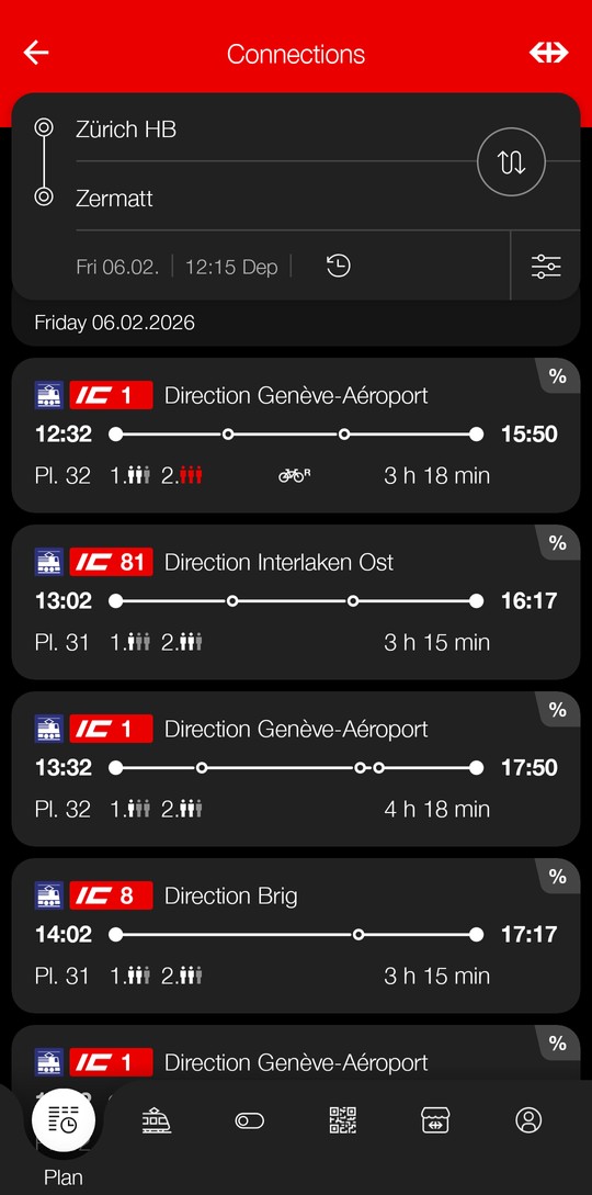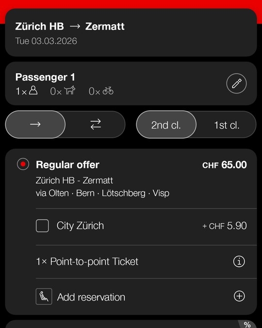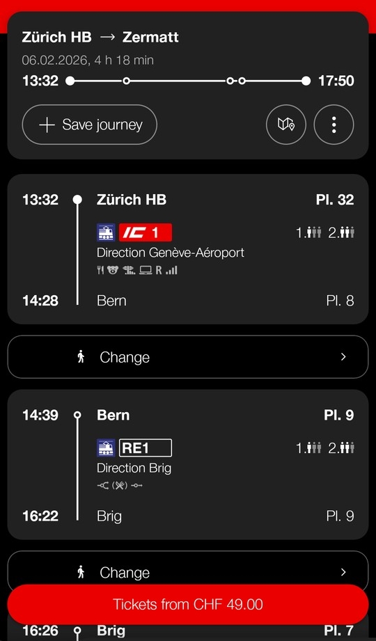 スイス鉄道SBBの公式アプリで、チューリッヒ(Zürich)からツェルマット(Zermatt)までの数ヶ月先の便を検索してみます(SBB公式アプリの使い方は後ほど詳細を説明します)。予約する便を選択します
