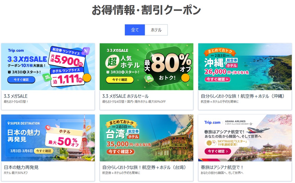 3.3メガセールは航空券やホテルの割引クーポンが提供される大規模なセールです。