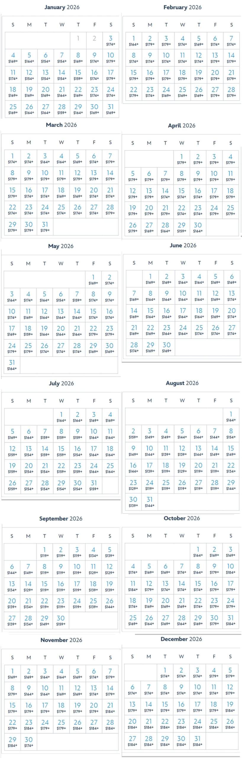 チケットの種類、日数で金額が変わります。下記は2026年1月から2026年12月までの1デーチケットの(最安)料金カレンダーです。